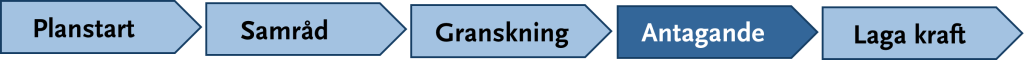 Detaljplanen handläggs med standardförfarande enligt plan- och bygglagen (2010:900). Planförslaget följer intentionerna i översiktsplanen och bedöms inte medföra en betydande miljöpåverkan.