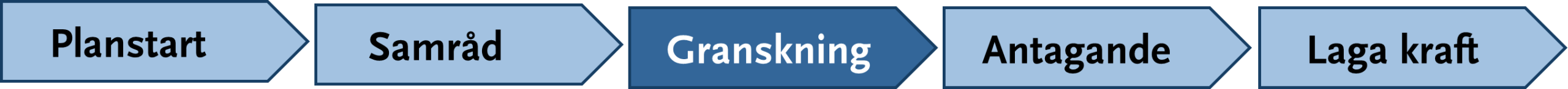 Planförslaget är nu utställt för granskning under perioden 2025-11-07 till och med 2025-11-25. Inkomna synpunkter från granskningen sammanställs därefter i ett s.k. utlåtande som sedan ligger till grund för eventuella revideringar innan beslut om antagande av detaljplanen.