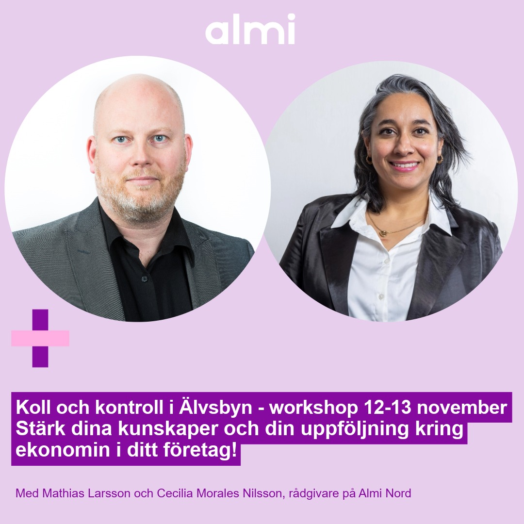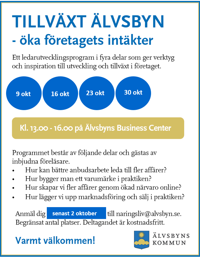 Nu är det dags för höstens omgång av Tillväxt Älvsbyn. Fyra träffar med start 9 oktober. Begränsat antal platser. Anmäl senast 2 oktober till naringsliv@alvsbyn.se