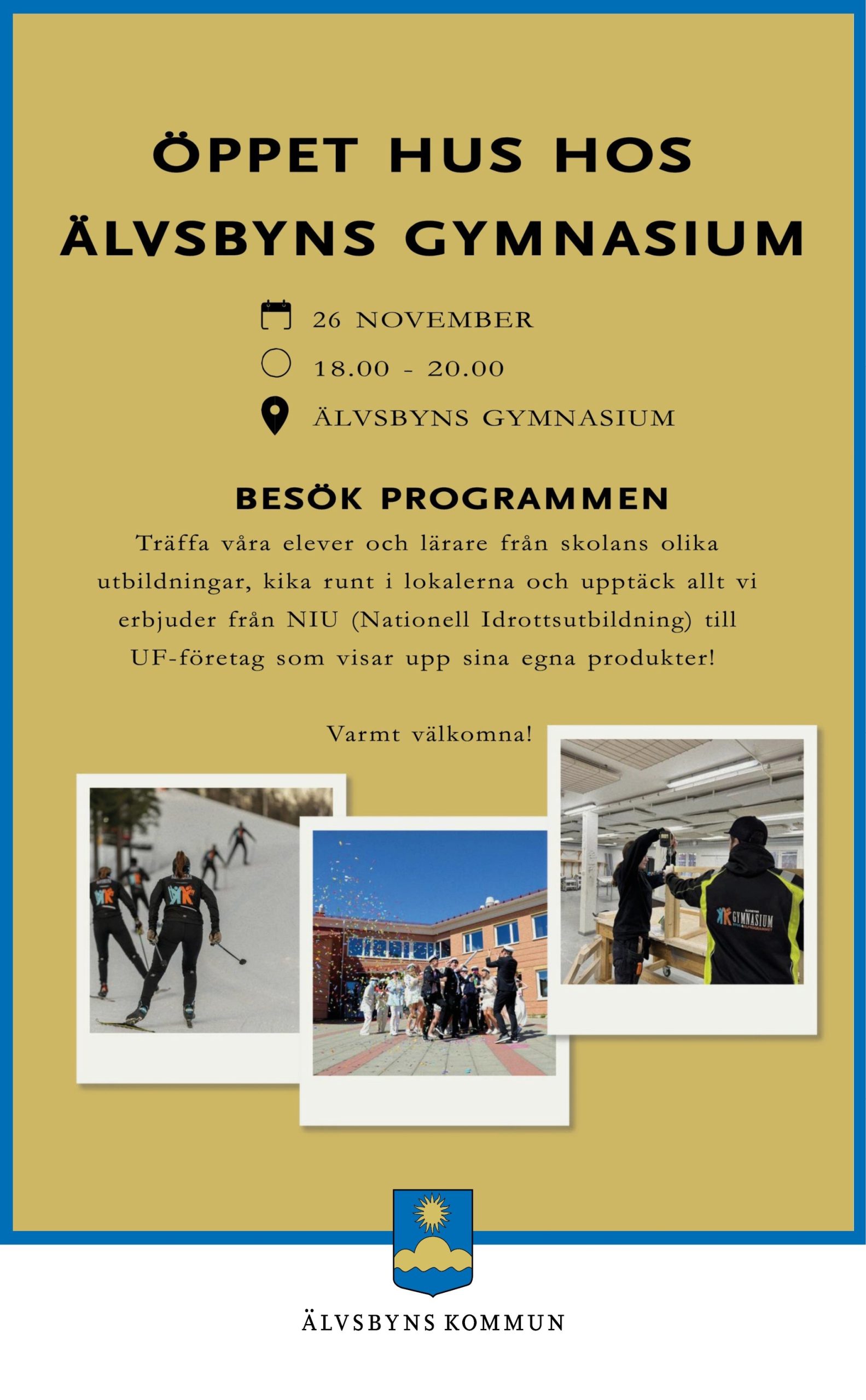 Den 26 november anordnas öppet hus på Älvsbyns gymnasium. Kom och träffa våra elever och lärare från skolans olika utbildningar, kika runt i lokalerna och upptäck allt vi erbjuder från NIU (Nationell Idrottsutbildning) till UF-företag som visar upp sina egna produkter!